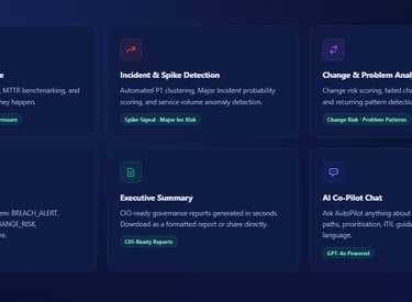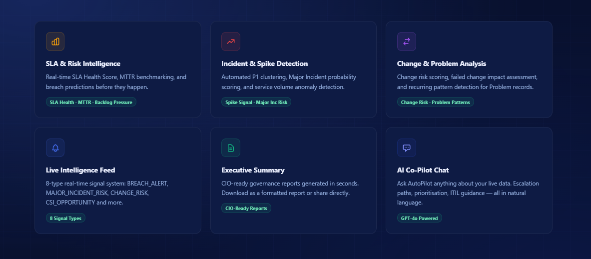 AutoPilot is the intelligence layer with agentic capabilities for your Service Management Office — automating signals, predictions and governance decisions across Incident, Request, Problem, Change and SLA in real time.